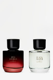 Eau de toilette set of two. RED VANILLA: A sophisticated, warm, and spicy fragrance with floral and sweet notes. A bright bouquet of elegant iris and red peony flowers, combined with juicy notes of mandarin and a sweet and delicate touch of raspberry, fused with vanilla accords. BLACK AMBER: The fragrance opens with a juicy fruity citrusy accord (mandarin, passion fruit, and cherry), revealing a sunny heart of gardenia flower and brought out with vibrant hints of hyacinth.